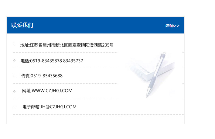 地址:常州市新北區友邦商務大廈1幢16、17層  電話:0519-85101652  傳真:0519-85112595  郵編:213022  網址:www.cz-jiayue_cn.fmsfjd.com  郵箱:xiajifengaa@163.com